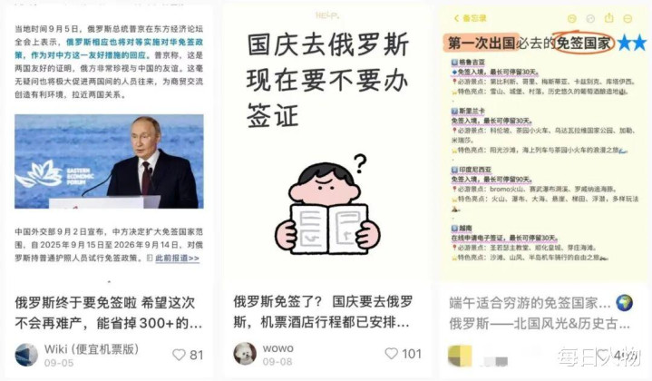 ▲ 近期社交平台上关于“俄罗斯免签”的讨论和旅行机构广告。图 / 小红书截图